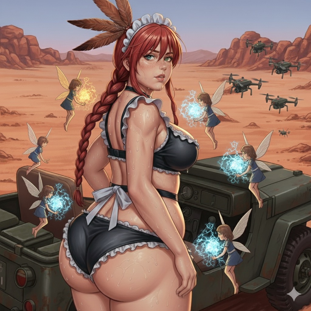 人類が滅び荒れ果てた地上を遊弋しているメイドたち。ロケランやドローンなど古代兵器も使うが、やはり頼りになるのは魔法と使役妖精である。